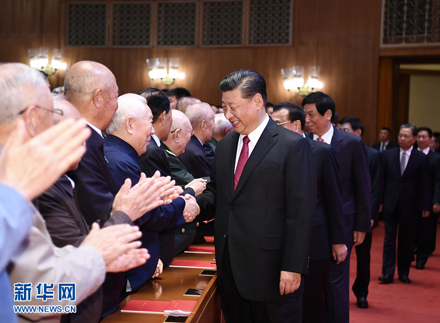 19時55分,在歡快的樂曲聲中,習(xí)近平等領(lǐng)導(dǎo)同志步入大禮堂,同老同志代表親切握手,向他們致以崇高敬意,全場響起熱烈掌聲。