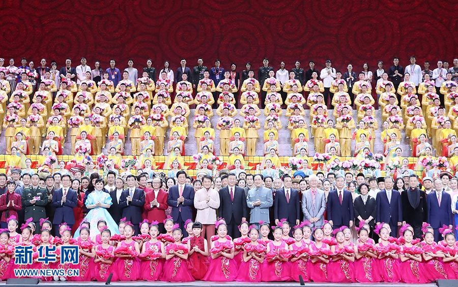 9月29日,慶祝中華人民共和國成立70周年大型文藝晚會《奮斗吧 中華兒女》在北京人民大會堂舉行。習(xí)近平、李克強、栗戰(zhàn)書、汪洋、趙樂際、韓正、王岐山等同4000多名觀眾一起觀看演出。演出結(jié)束后,習(xí)近平等走上舞臺同演職人員合影留念。 新華社記者 王曄 攝
